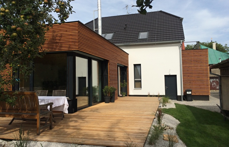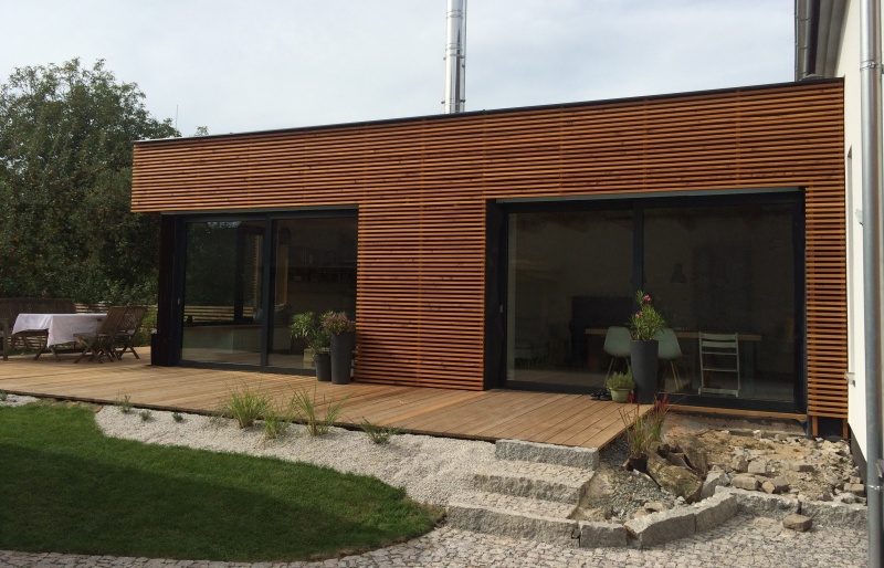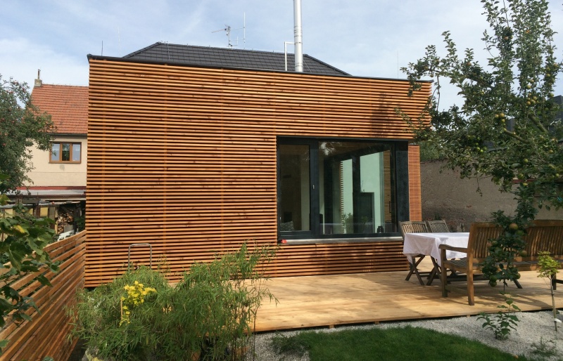 modřín s rozměry 30/50 mm. Obkladové latě jsou z důvodu prostorového kladeny s menším rozměrem na výšku. To znamená na výšku 30 mm a jsou v osových vzdálenostech rovněž tak na 30 mm.