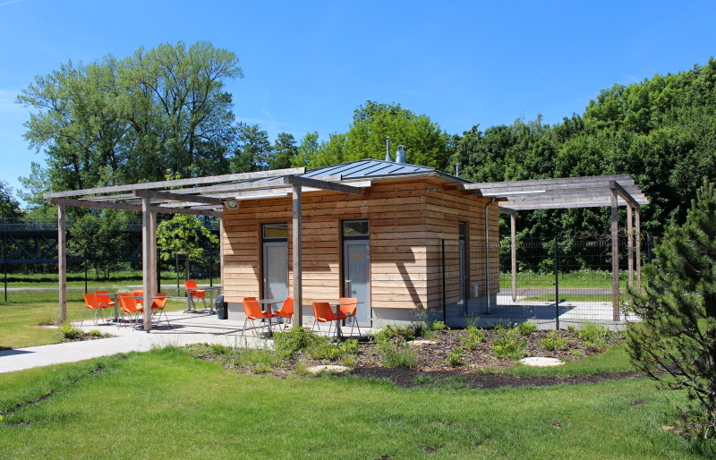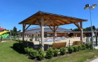 Následnou realizací jsou dva dřevěné přístřešky. Jedná se o samostatně stojící dřevěné konstrukce o půdorysných rozměrech cca 6 x 6 m. Oba jsou vyrobeny z hraněného hoblovaného smrkového řeziva a opět ošetřeny pouze impegnací. Jeden z nich ( přístřešek pro občerstení ) je navíc doplněn ze dvou stran o přilehlé dřevěné konstrukce venkovních pergol o půdorysných rozměrech ca 7,5 x 7,5 m.